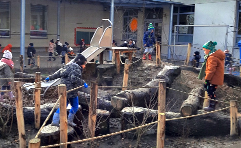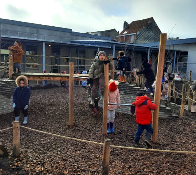 Er zijn verschillende plekjes waar de kleuters kunnen klimmen en klauteren. De kleuters kunnen ook koken in de twee buitenkeukens die zich op de speelplaats bevinden.